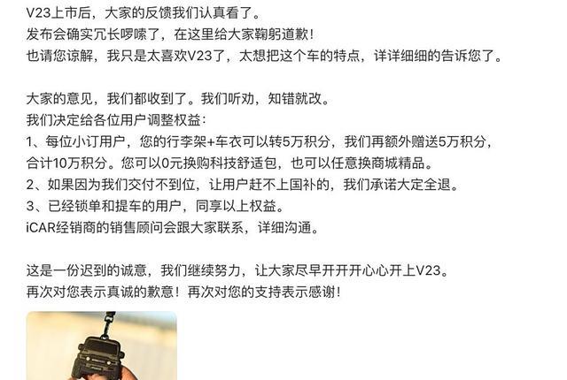 固然智米科技创举东说念主CEO、iCAR汽车首席居品官苏峻近日调节iCAR V23的用户权柄,但后果似乎并不是很理思,只可说且行且颐养吧。