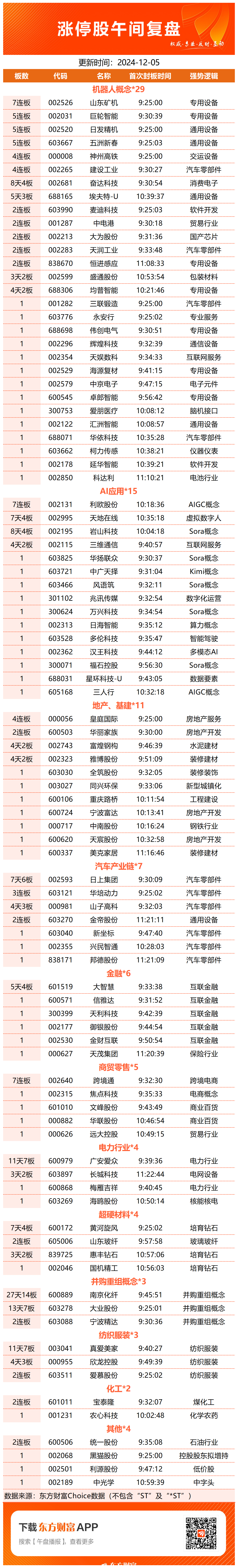 当天(12月5日)市集早盘颠簸反弹,三大指数小幅高涨,两市半日成交额9309亿,较上个来昔时缩量867亿。畛域午间收盘,沪指涨0.16%,深成指涨0.34%,创业板指涨0.56%。 板块方面,Sora成见、耕种钻石、脑机接口、东谈主形机器东谈主等板块涨幅居前,食物、养鸡、贵金属、油气等板块跌幅居前。 涨停个股数目方面,畛域收盘,当天经营98股涨停,另有36只个股盘中一度涉及涨停,封板率73.13%。 个股方面,沪深盘面上市集热门主要围绕AI运用和机器东谈主两个主张张开, AI运用主张集体大涨,