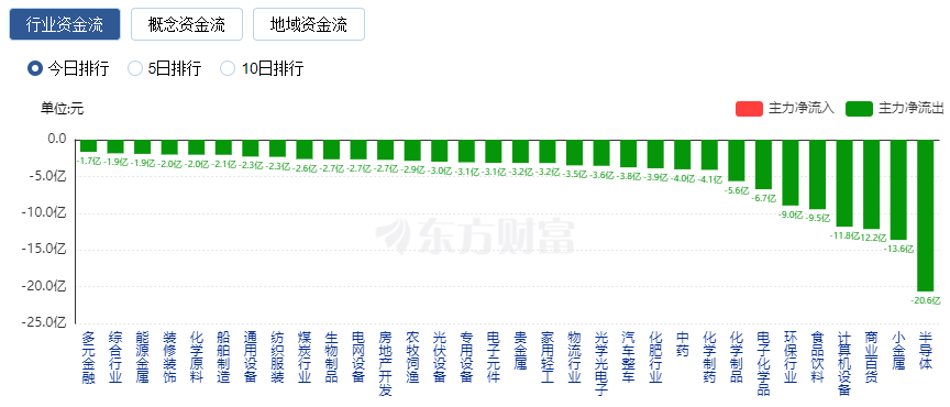 净流出方面,半导体、小金属发等排行靠前,其中半导体净流出20.6亿元。