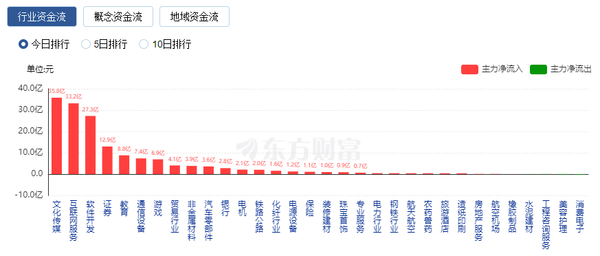 行业资金方面,畛域午间收盘,文化传媒、互联网作事等净流入排行靠前,其汉文化传媒净流入35.8亿元。