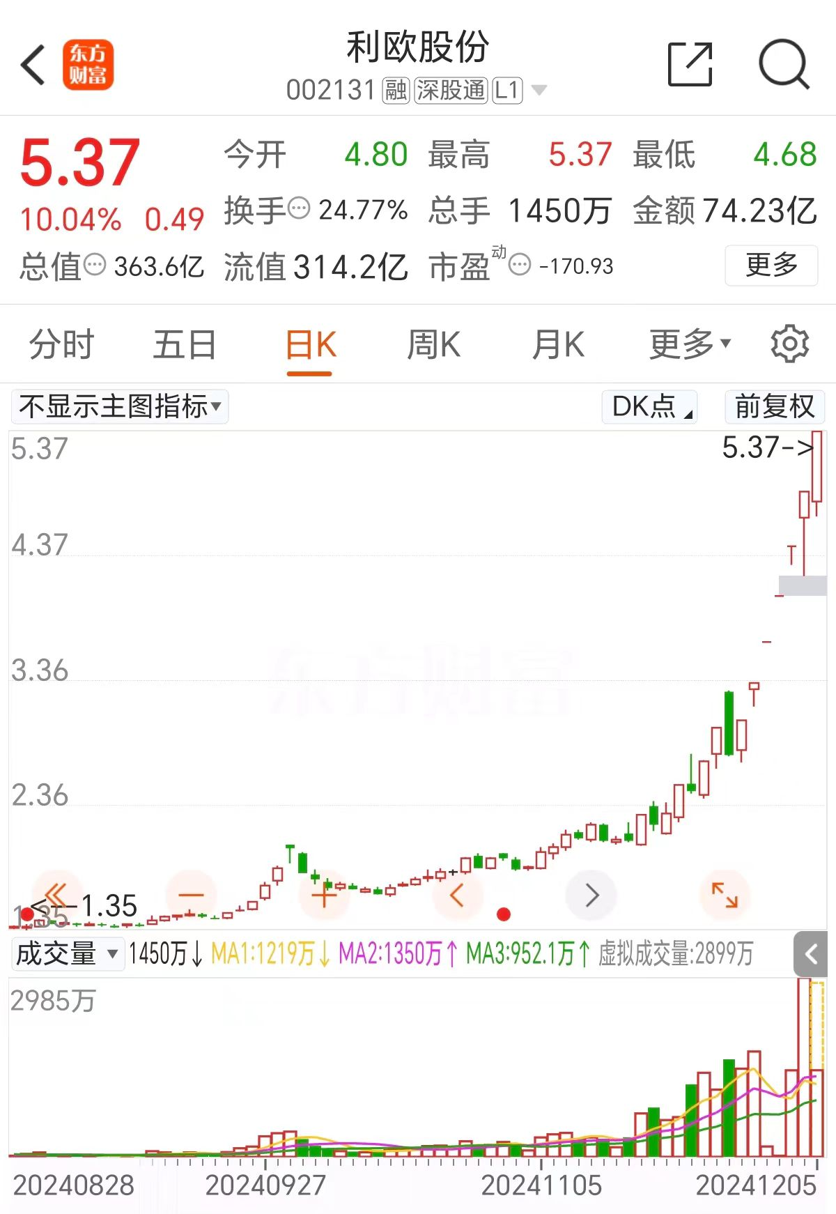 个股成交金额方面,畛域午间收盘,利欧股份位列第二,成交金额74.23亿元。