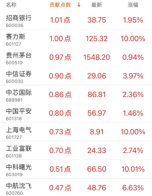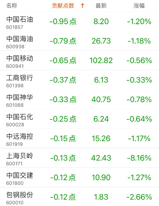对上证指数孝敬点数最多的个股是招商银行,孝敬1.01点,该股当日涨1.95%,收盘价38.75元;牵累点数最多的个股是中国石油,牵累0.95点,该股当日跌1.20%,收盘价8.20元。