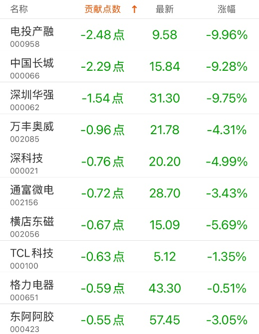 对深证成指孝敬点数最多的个股是比亚迪,孝敬24.8点,该股当日涨5.74%,收盘价306.98元;牵累点数最多的个股是电投产融,牵累2.48点,该股当日跌9.96%,收盘价9.58元。
