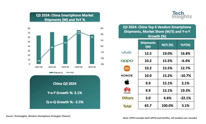 11月4日,市调机构TechInsights最新阐显著示,2024年第三季度,中国不息保执宇宙最大单一智高手机市格式位,智高手机出货量同比增长3%达到6570万部,贯穿三个季度保执复苏态势。