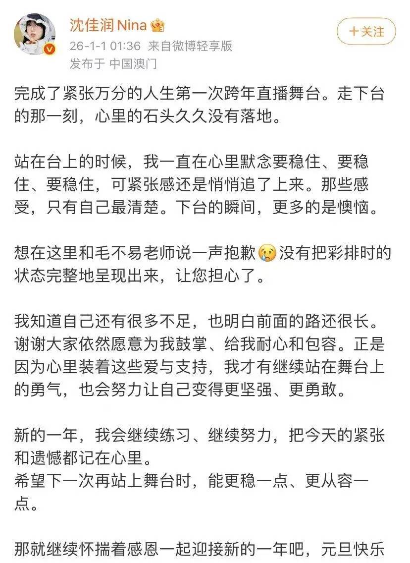 沈佳润向毛不易说念歉,亦然向悉数不雅众致歉。她示意首次登上跨年舞台杰出弥留,即便上台后告诉我方要稳住,最终仍是证明失常,远不如彩排时。这也讲解江苏卫视的跨年献艺是全开麦真唱,出现轻视也能连气儿,毕竟她才20岁,饰演造就有限。