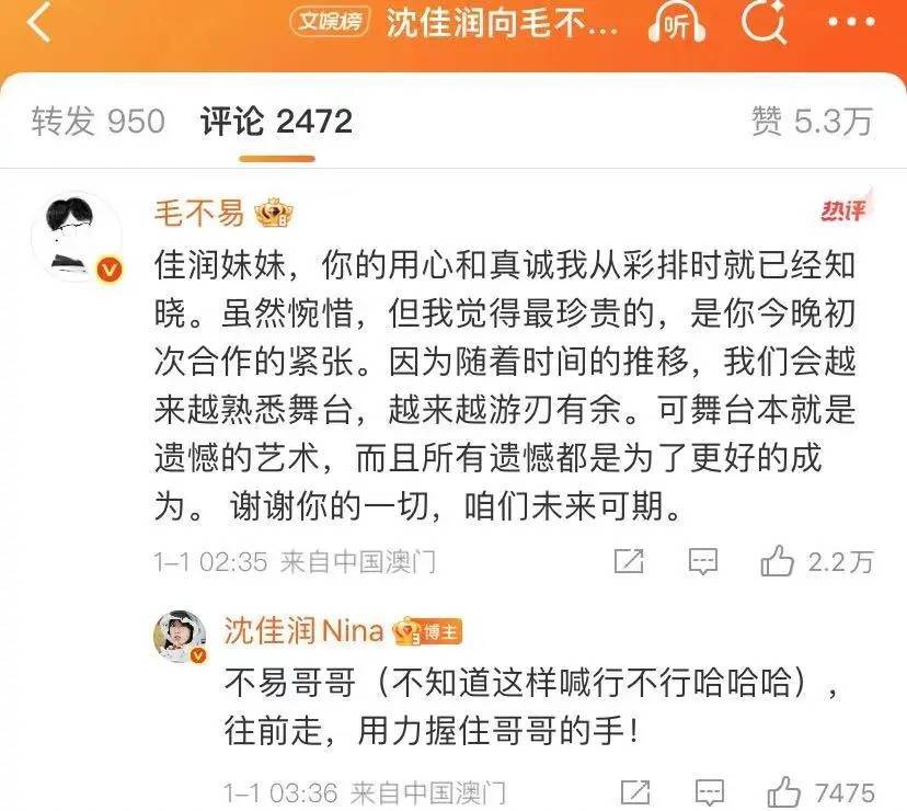 小沈阳男儿沈佳润在韩国出说念后到内地发展,这次进入江苏卫视跨年晚会献艺。她先是演唱成名作《好意思好意思sunday》,完成度较高。**但之后与毛不易齐唱《不染》时景况频出,跑调严重还抢拍,高音也上不去,确实拖了毛不易后腿,毛不易演唱的两首歌曲,就这么被毁灭了一首**。 毛不易确实有些无奈,这似乎并非单纯弥留所致,要害是对歌曲不够持重。如果沈佳润作念足准备,也不至于如斯。难说念是她不心爱这首歌是以没作念好作业,又或是示知太仓促?且看后续他们怎样修起。 沈佳润向毛不易说念歉,亦然向悉数不雅众致歉。