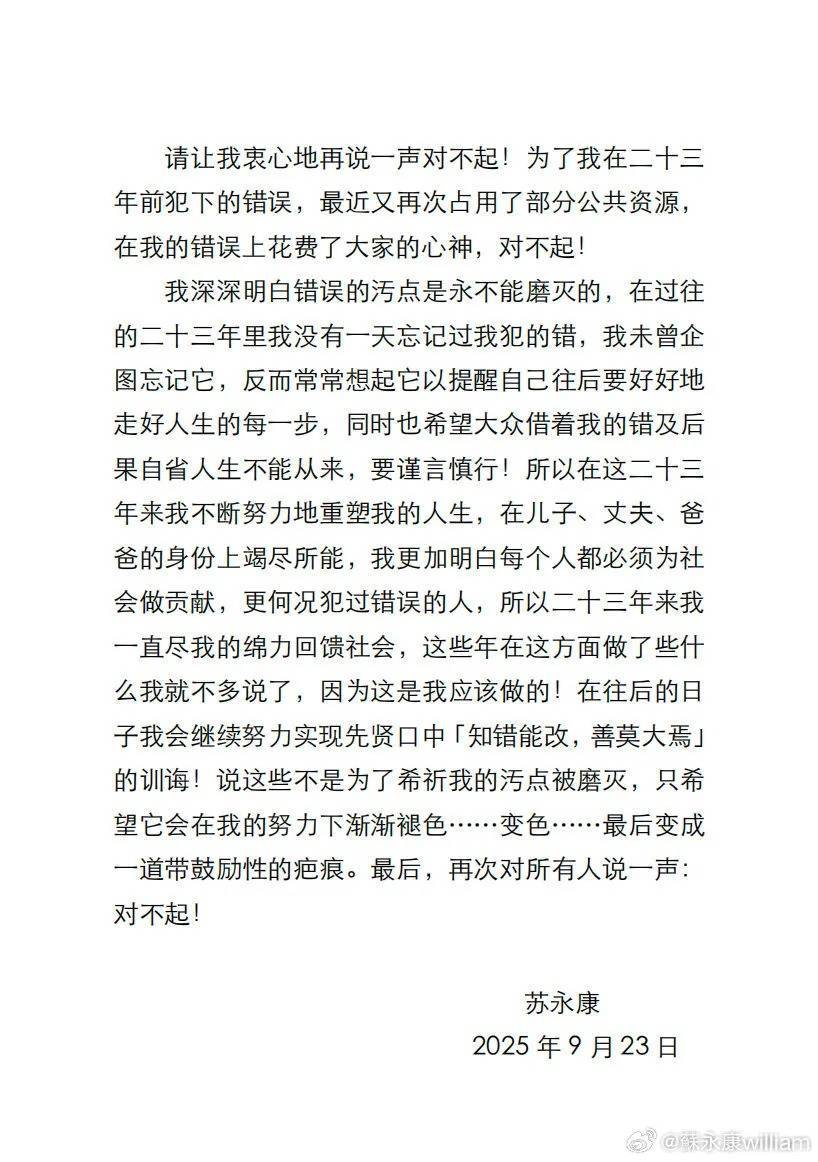 苏永康称,“我深深显着诞妄的瑕玷是永弗成消散的,在过往的二十三年里我莫得一天健忘过我犯的错,……在往后的日子我会链接勤恳完结先贤口中「知错能改,善莫大焉」的阅历。”