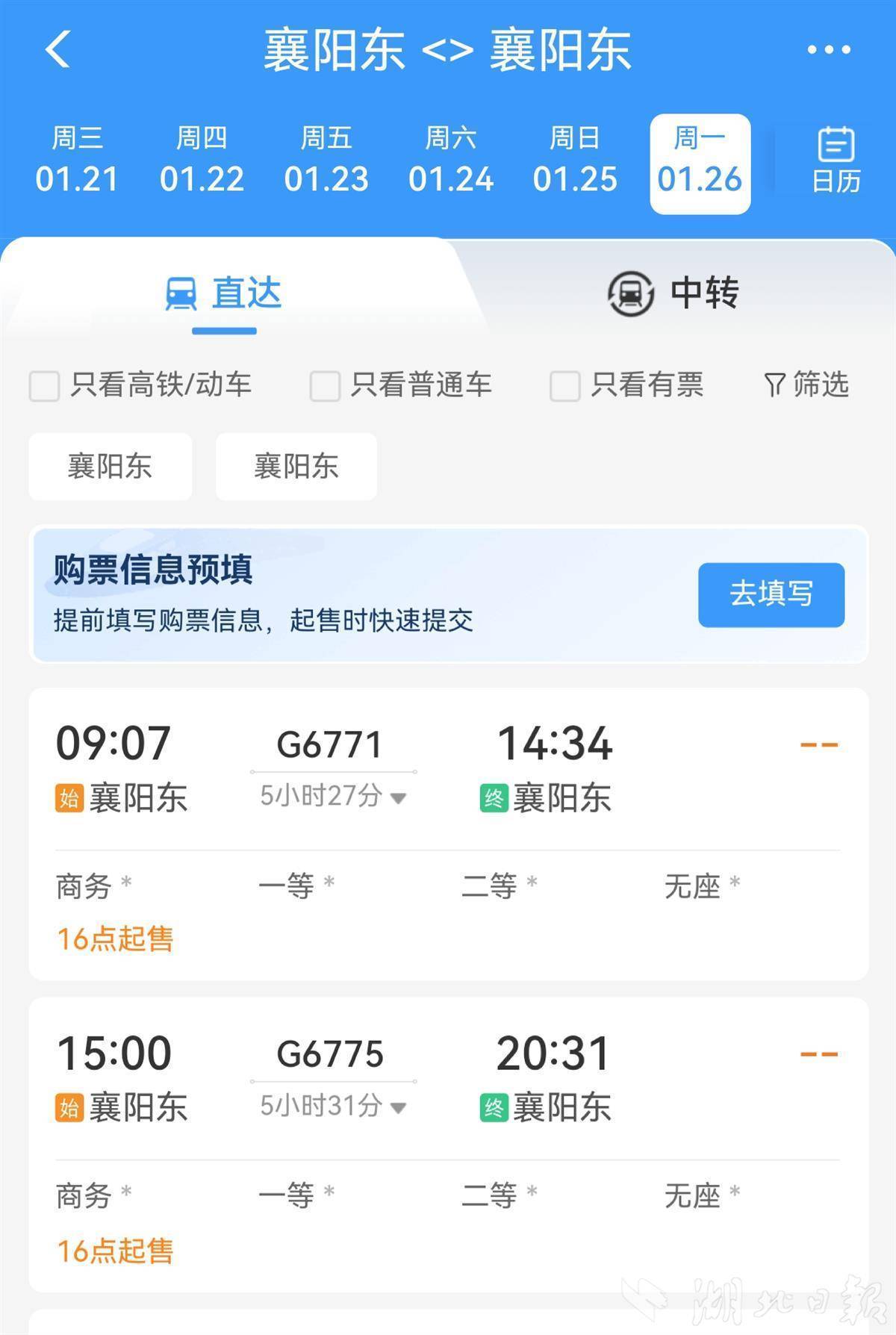 湖北日报讯(记者胡祎)铁路12306APP夸耀,1月26日起,铁路部门将通畅“襄阳东至襄阳东”环线列车。车次每天2趟,分手为G6771、G6775。