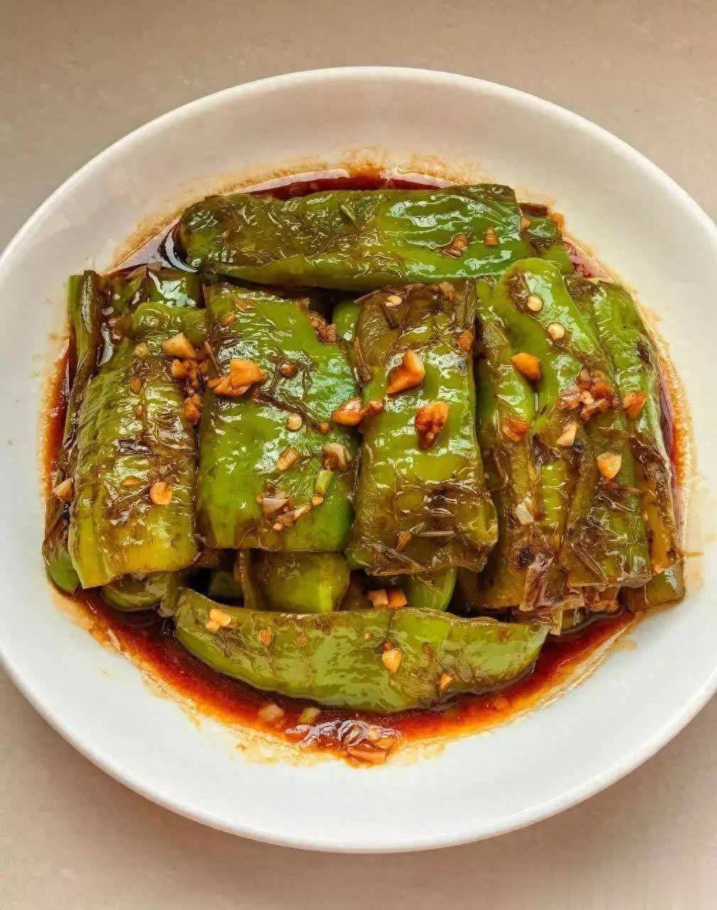 4. 裹汁:放尖椒翻炒均匀,让酱汁裹满即可。要津:尖椒选肉厚的,煎时耐性按压,武艺起皱入味。