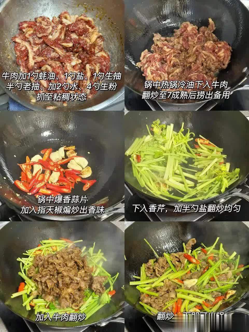 3. 炒制:热锅冷油,下姜片爆香,放肉丝滑炒至变色,加西芹翻炒;
