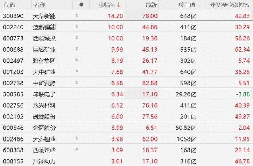 A股商场锂矿股午后拉升,其中,天华新能涨超14%,盛新锂能、西减城投、国城矿业10CM涨停,雅化集团涨超8%,大中矿业涨超7%,中矿资源、奥联电子、永兴材料、融捷股份涨超6%。讯息面上,广碳酸锂主力合约日内涨超4%,站上16万元/吨。
