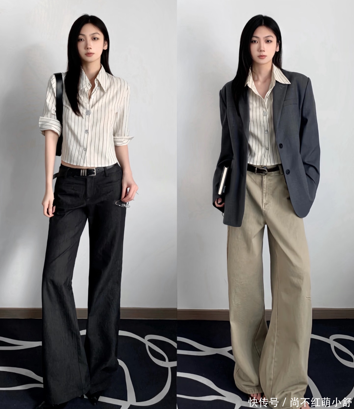 竖条纹衬衫:内搭“白色打底衫+竖条纹衬衫(解开2颗扣子)+ 高腰牛仔裤”,通勤穿干练显高。