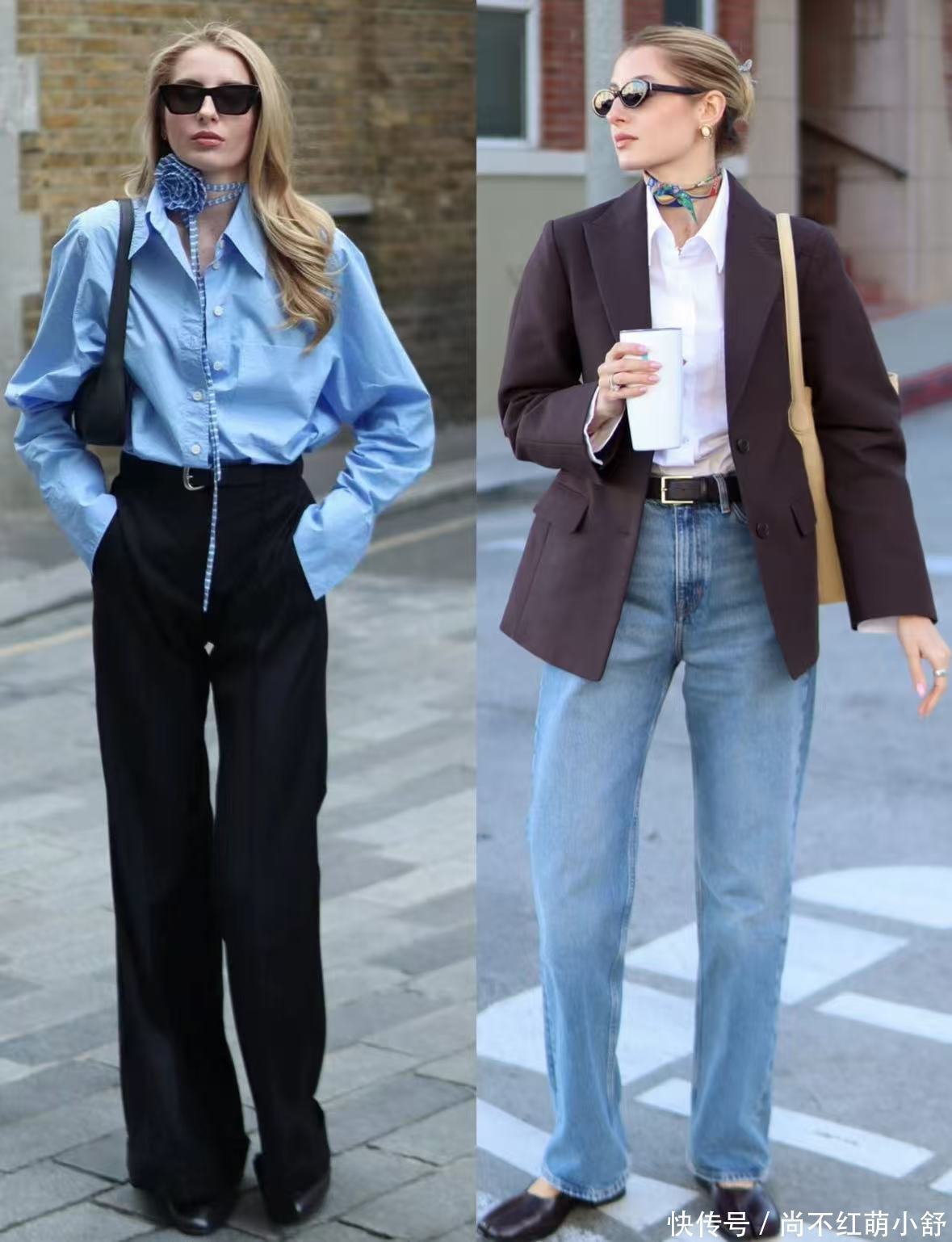 半塞法:把上衣前半部分塞进裤子,后半部分当然垂下,适当厚毛衣、宽松卫衣,比如“宽松衬衫(前半塞)+ 高腰西装裤”,慵懒又不压个子。