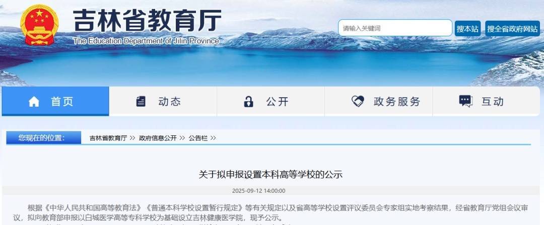 据白城医学高级专科学校官网,11月7日,该校召开2025-2026学年教养科研使命会议。本次会议是在学校全力冲刺升格医学本科院校的要害期间召开的一次遑急计谋部署会,旨在系统盘算教养科研使命,凝合发展共鸣,全面赋能学校向医学本科评释转型,秀雅着学校医学本科评释成就投入全面加快的新阶段。 吉林省评释厅公示。图/吉林省评释厅 校长孙佳昭示意,学校将深远产教交融,推动校企勾搭,构建"病房-施行室-课堂"领路的育东谈主机制, 推动评释教养改换向纵深发展。 九派新闻梳剪发现,2025年9月12日,吉林省评