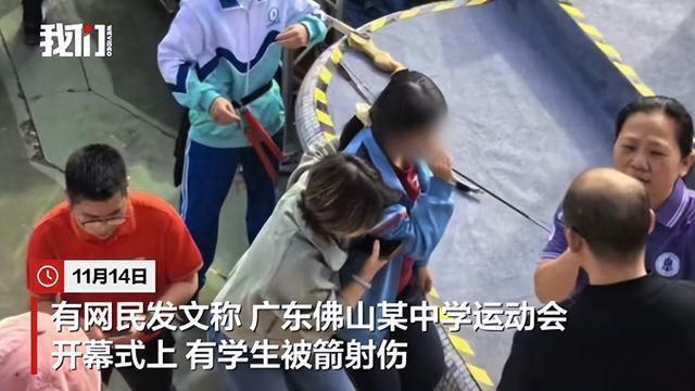 11月14日,有网民发文称,广东佛山某中学畅通会开幕式上,有学生被箭射伤。有眼见者称,系开幕式射箭饰演发生恐怕,箭命中一女学生面部。