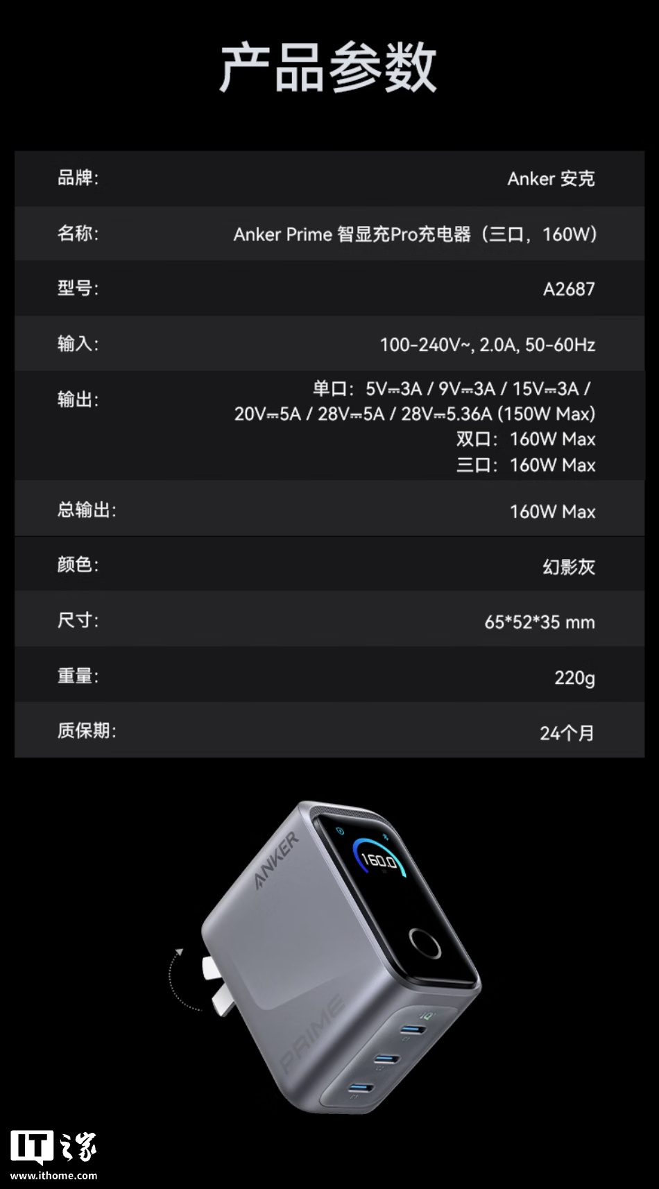 具体规格方面,该居品尺寸为 65x52x35mm,分量为 220g,提供 3 个 USB-C 接口,单口输出峰值在 140W-150W 之间,双口 / 三口峰值 160W。